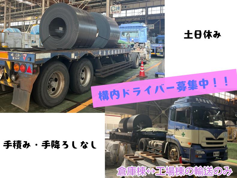 | 仕事内容 | ■具体的な業務内容■ ━━━━━━━━━━ 構内にて倉庫棟↔工場棟の横持ち作業をお願いします! <輸送品> コイル  ̄ ̄ ̄ ̄ ̄ ̄ ̄ ̄ ̄ ̄ ̄ ̄ ̄ ▽手積み・手降ろしなし!! 荷物の積み降ろしは、荷主作業員が天井クレーンで行います! |