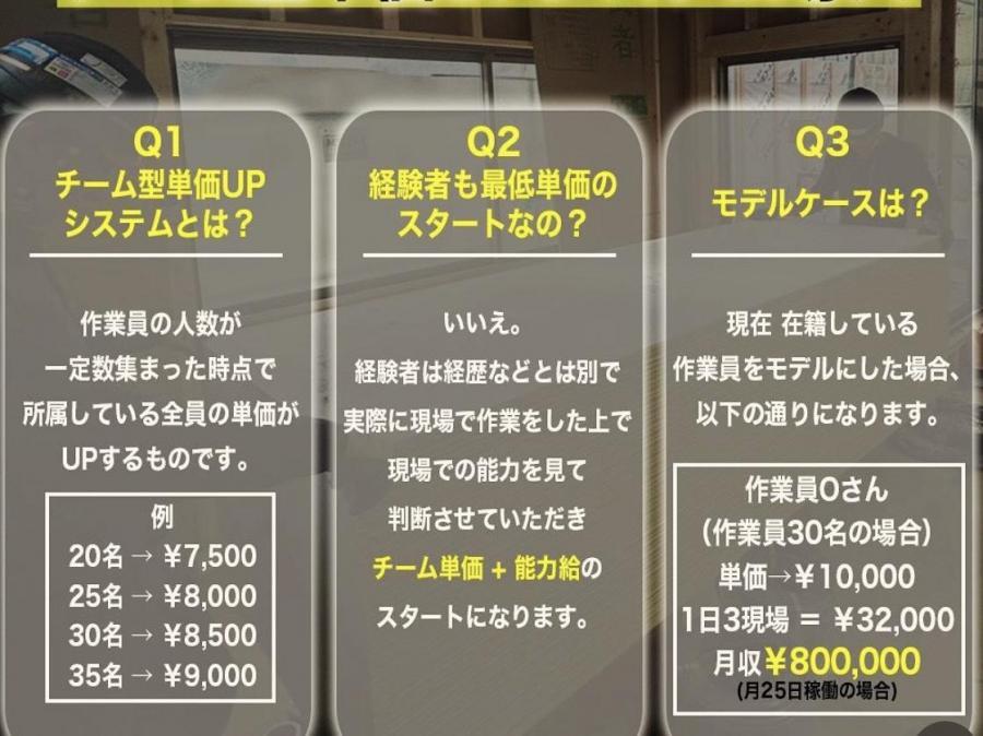 | 仕事内容 | 木造住宅・非住宅、その他建築現場でその日に届いた資材を指定の場所へ運ぶ仕事! その他 ・自社トラックでの運搬(免許保持者) ・軽作業 ・産廃収集 など。。。 基本2人1組で行動する為、未経験者でも安心して働けます。 ★荷揚業界”初”★ チーム型単価UPシステム導入! Q1.チーム型単価UPシステムとは? A.作業員の人数が一定数集まった時点で所属している全員の単価がUPするシステム! Q2.経験者も最低単価スタート? A.経験者は実際に現場での作業能力をみて判断させていただき「チーム単価+能力給」のスタートになります。 Q3.モデルケースは? A.現在在籍中の作業員をモデルにした場合、以下の通りになります。 作業員Oさん〈作業員30名の場合〉 単価⇒10,000円 1日3現場=32,000円 月収800,000円〈月25日稼働した場合〉 |