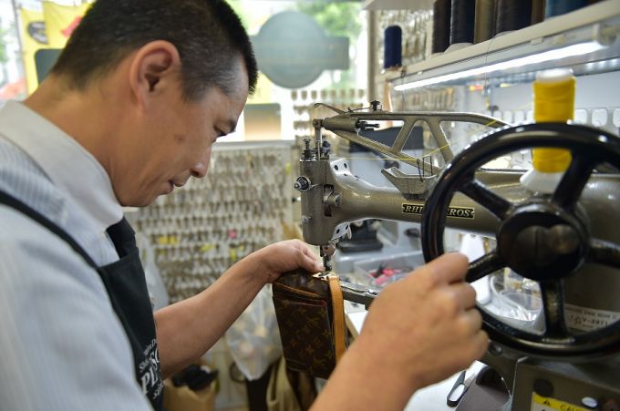 かばん修理の作業風景。ミシンを使って一針一針ていねいに縫います。